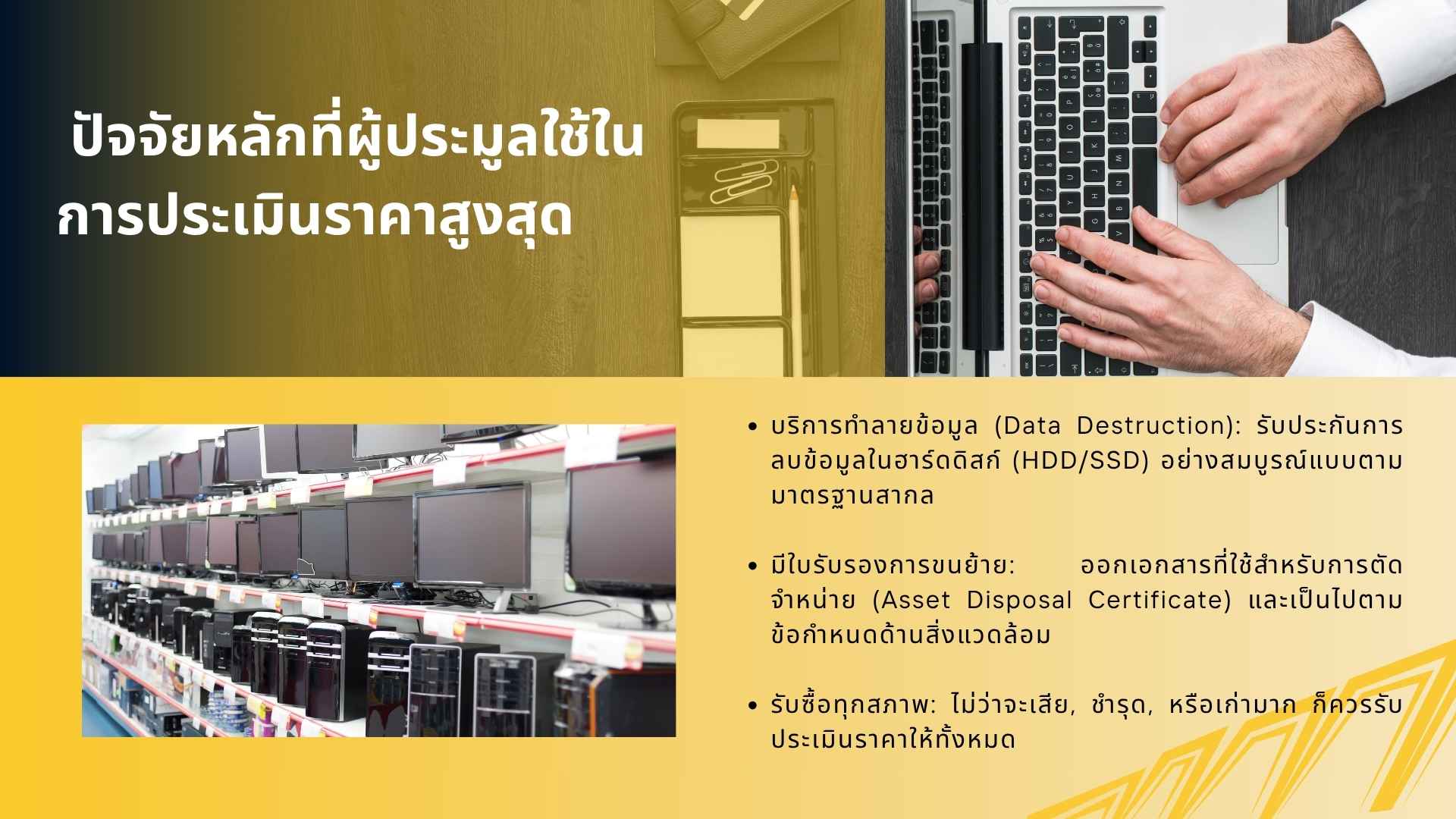 สำหรับองค์กร, บริษัท, หรือสถาบันการศึกษาที่มีคอมพิวเตอร์และอุปกรณ์ IT เก่าจำนวนมากที่ต้องการจำหน่ายทิ้ง (Asset Disposal) การประมูลเป็นทางเลือกที่ช่วยให้ได้ราคาสูงที่สุดและกำจัดอุปกรณ์ได้อย่างถูกระเบียบ บทความนี้สรุปขั้นตอนและสิ่งที่ต้องพิจารณาเมื่อต้องการใช้บริการ “รับประมูลคอมพิวเตอร์” อย่างมืออาชีพ